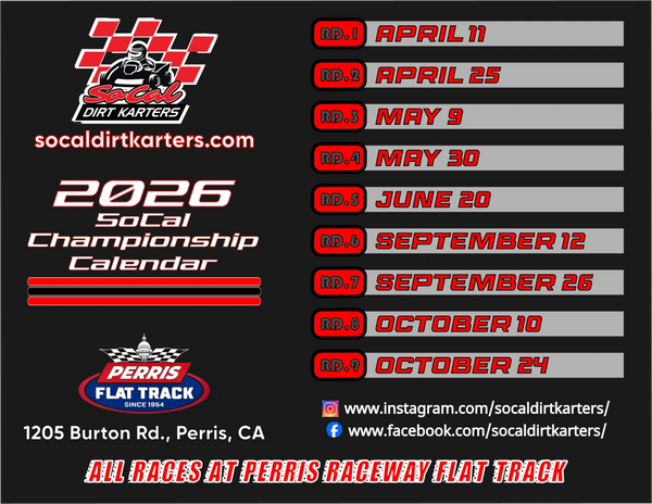 So Cal Dirt Karters announces a nine-race schedule starting in April and wrapping up in October at our home track, Perris Flat Track!