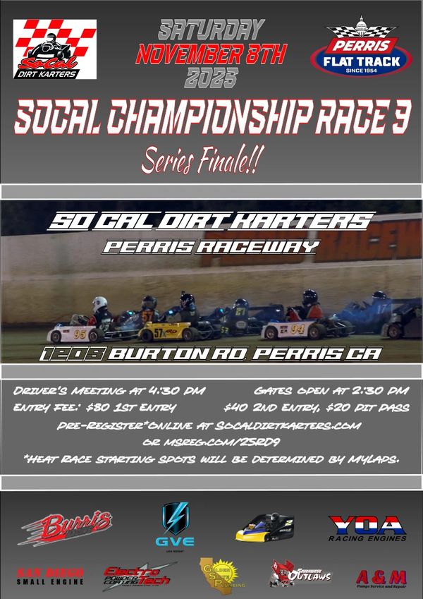 So Cal Championship Series Race 9 Pre-Registration Open! Pre-Registration is now open for season-opening SoCal Championship Series Race 9 at Perris Flat Track! Pre-Register at msreg.com/25RD9 also linked at socaldirtkarters.com